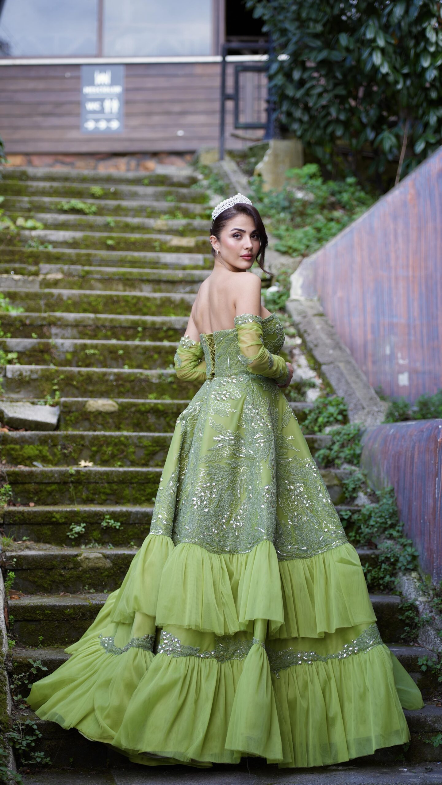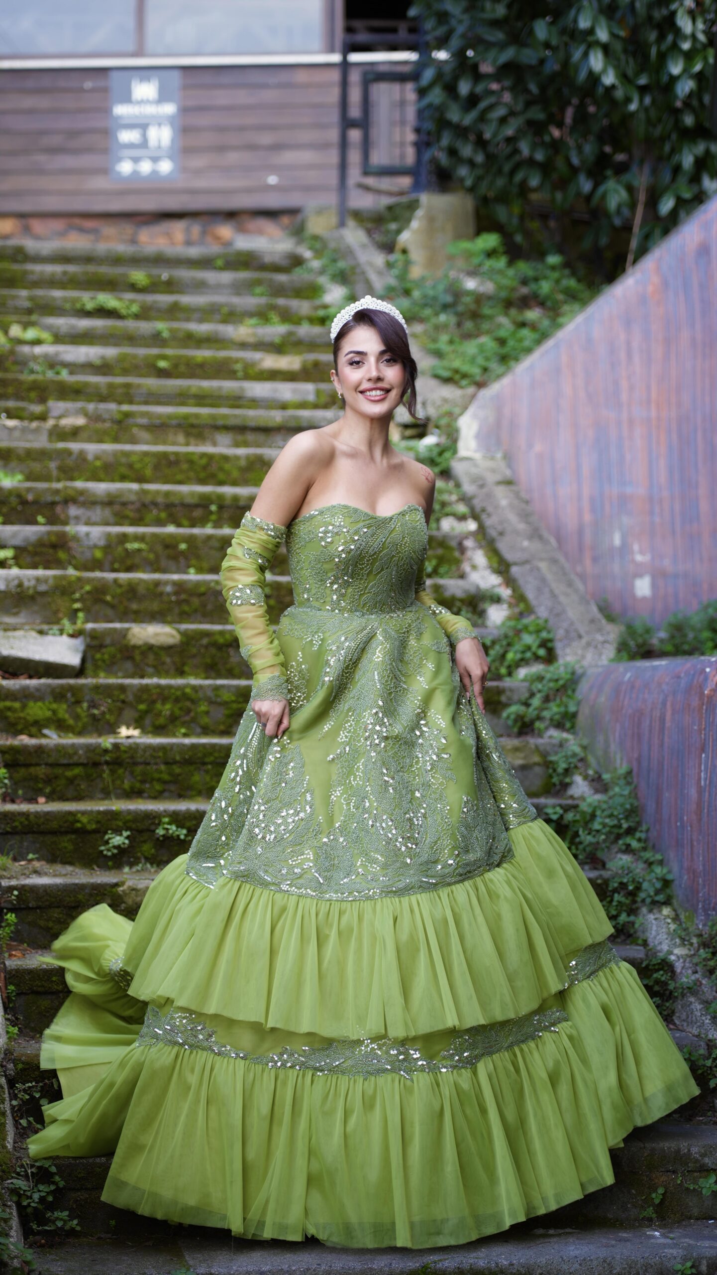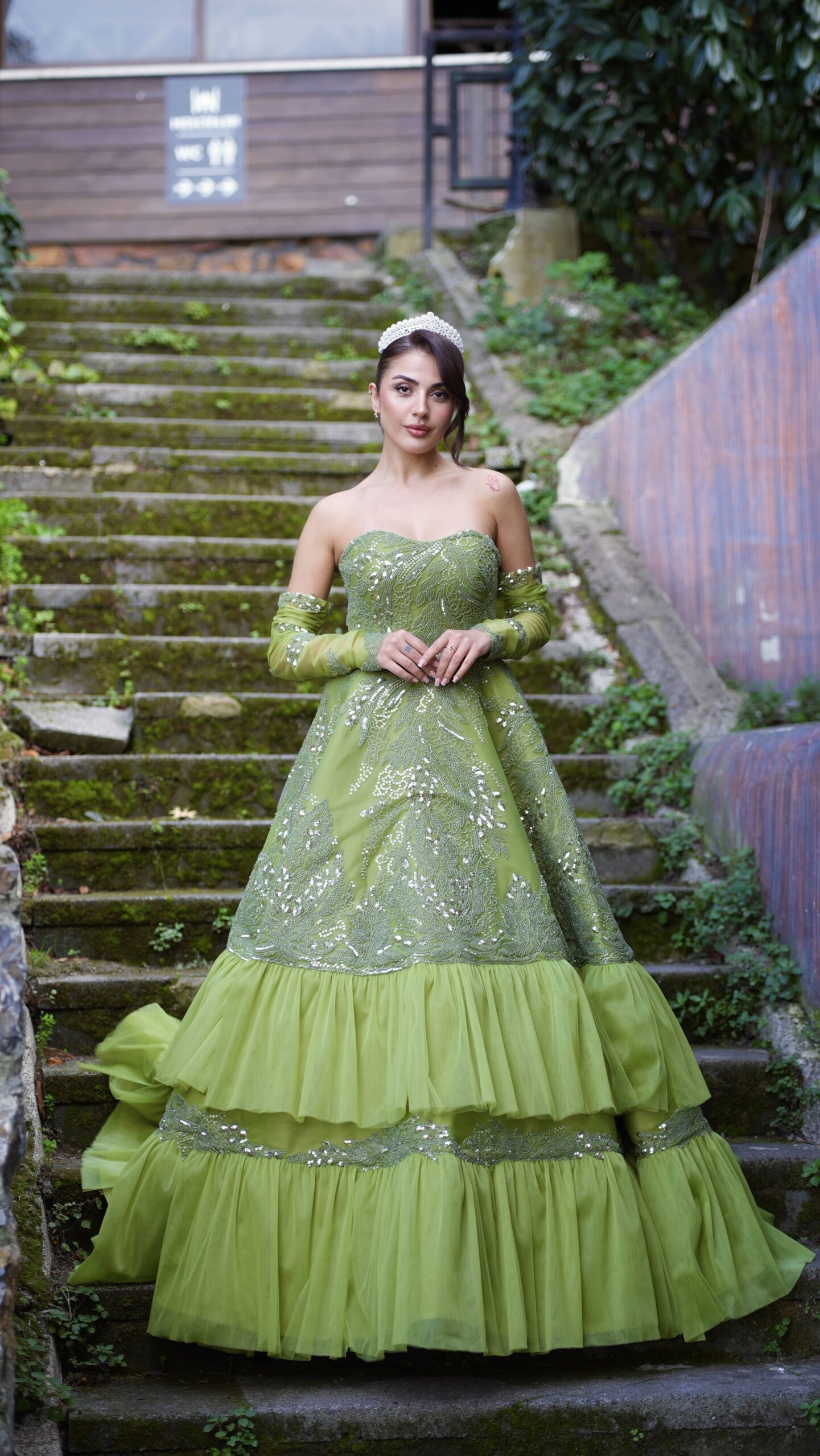 Yumuşak yeşil tonu, katmanlı tül formu ve zarif işlemeleriyle DEFNE, masalsı ama güçlü bir duruş sunuyor.