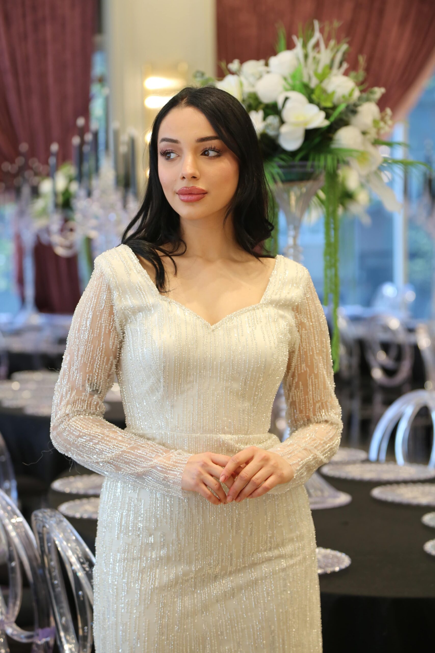 Kalp yaka detayı, ince boncuk işlemeleri ve zarif formuyla bu tasarım, tüm bakışları üzerinde toplayacak.