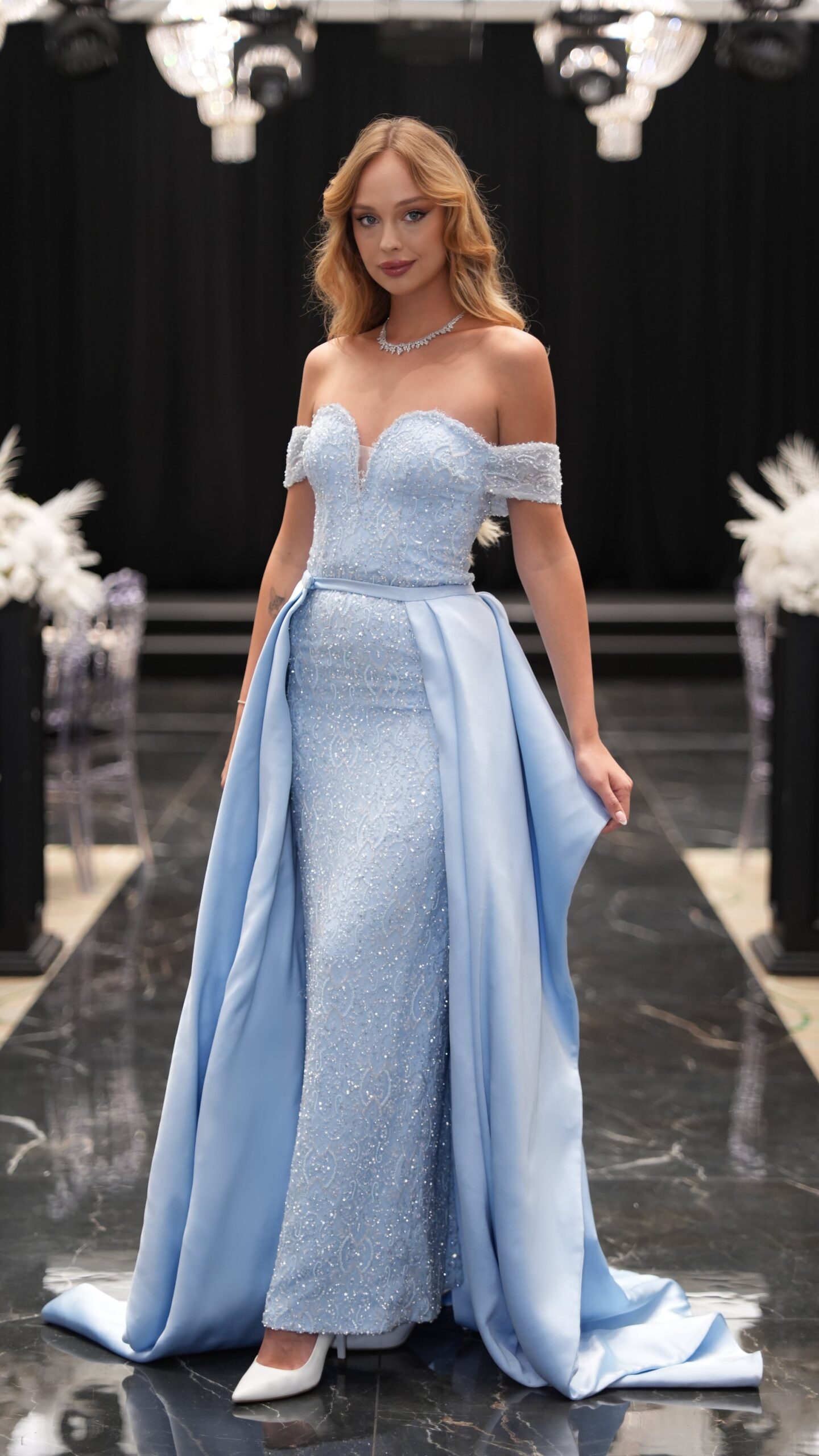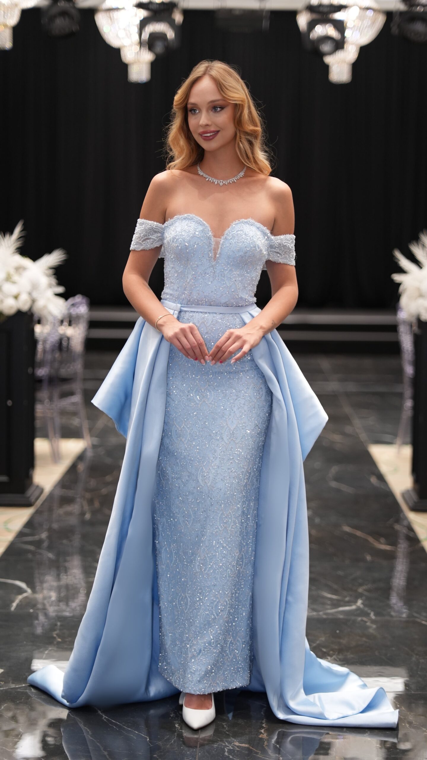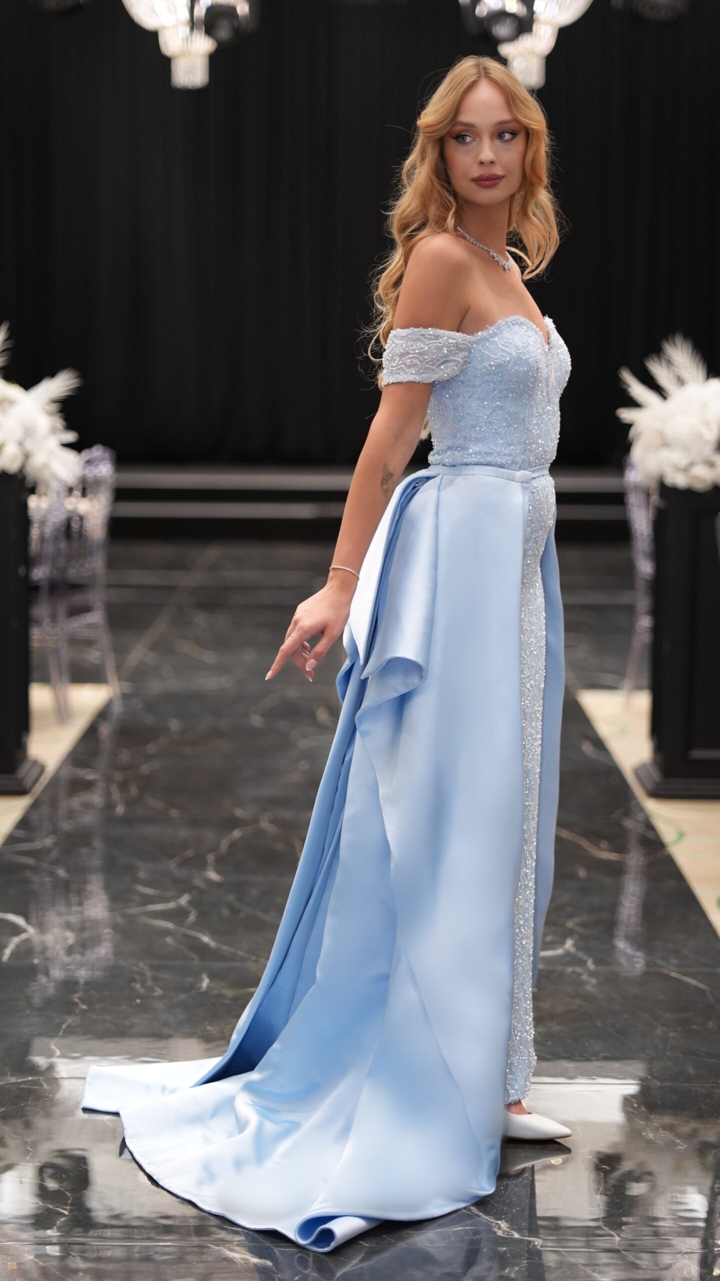 Gökyüzü mavisinin huzurunu ve ışıltılı işlemelerin büyüsünü taşıyor. Omuzdan düşen zarif kesimiyle romantik, taş detaylarıyla göz alıcı…